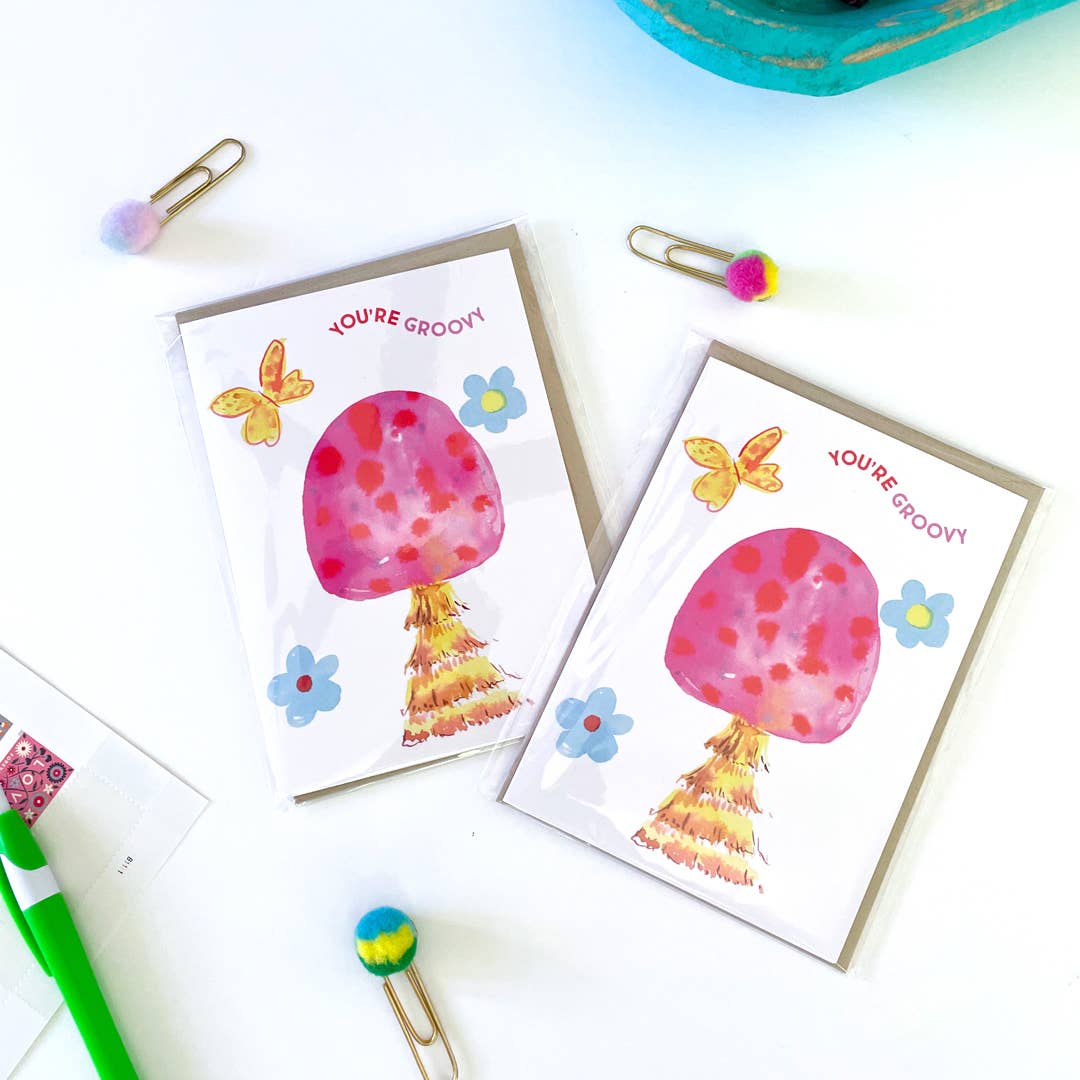 Tell someone just how groovy they are with this adorable watercolor mushroom greeting card.
