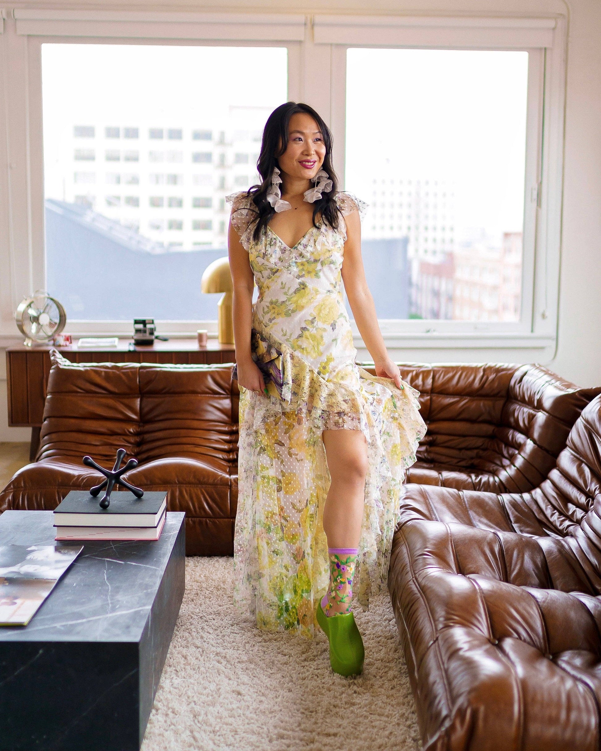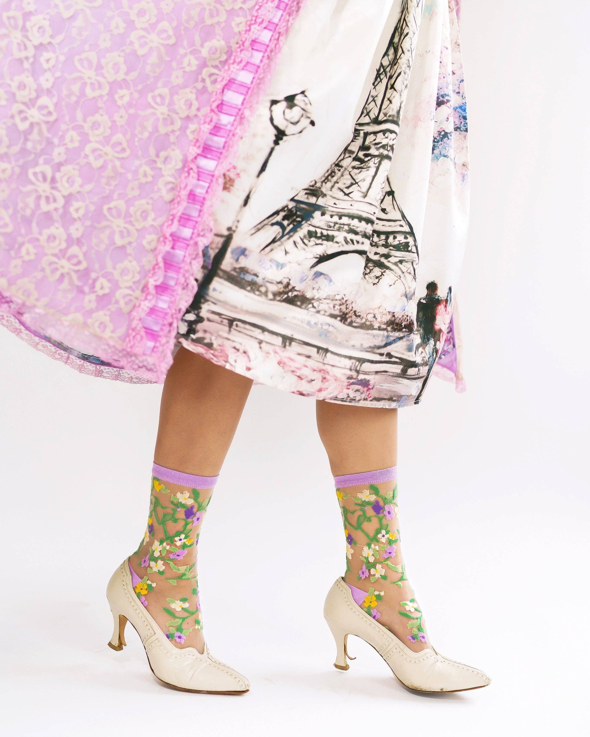 Delicate lavender and yellow florals are set on green vines, forming two intertwined hearts at the ankle of these pretty crew socks. Perfect for pairing with floral dresses and adding a soft romantic touch to your look. Finished with a lavender cuff and ankle for an extra feminine vibe.