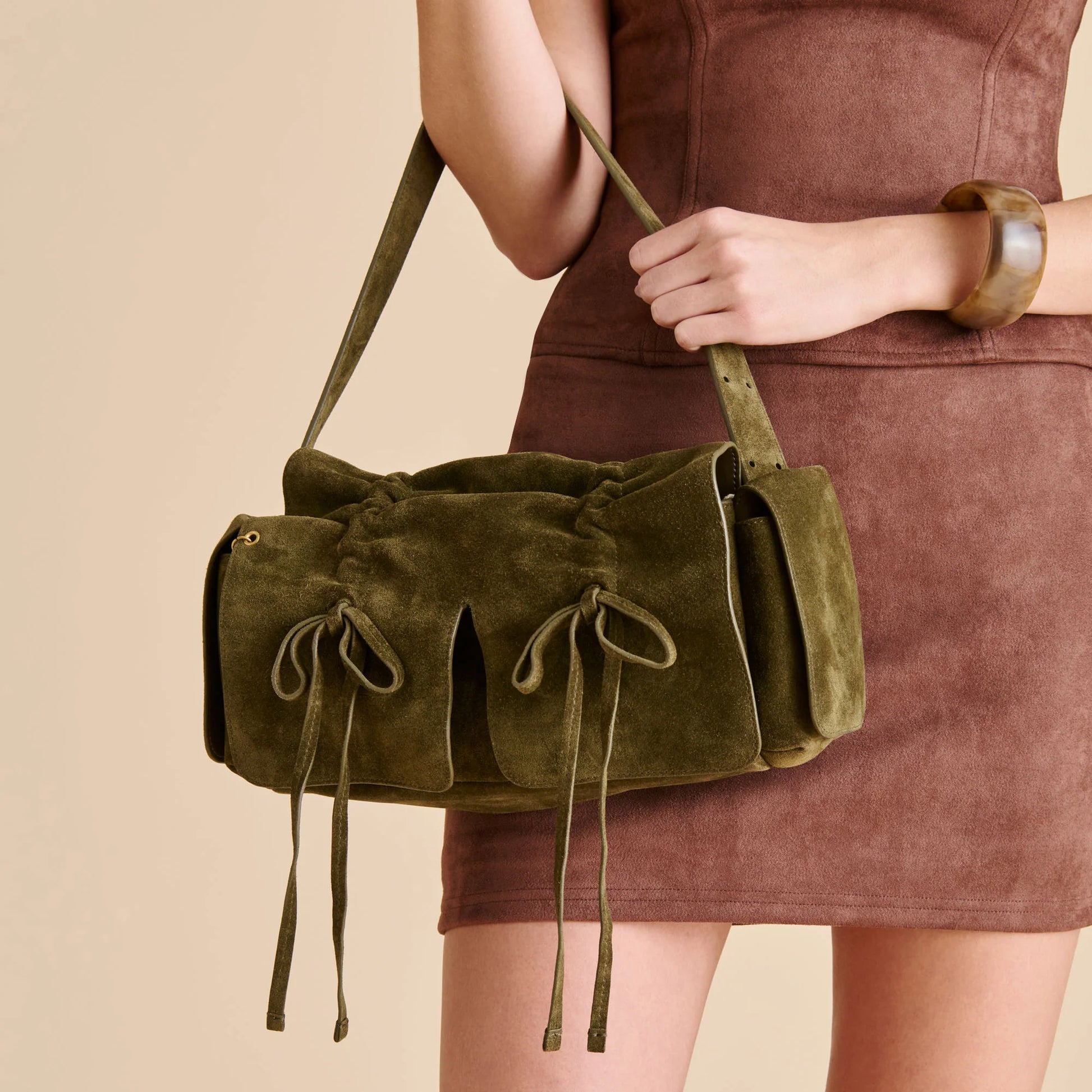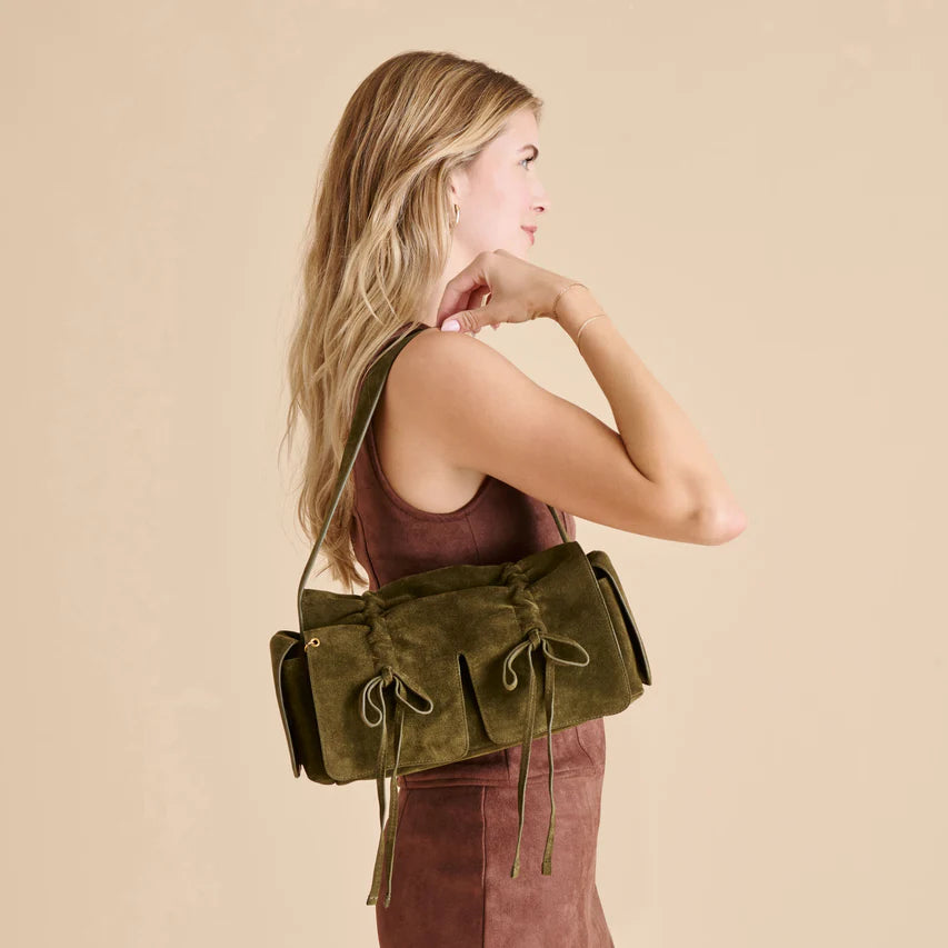 Elevate your cool weather wardrobe with HUDSON’s eye-catching details and earthy olive suede design. This rectangular shoulder bag’s exterior pockets feature a unique drawstring closure that draws extra interest.