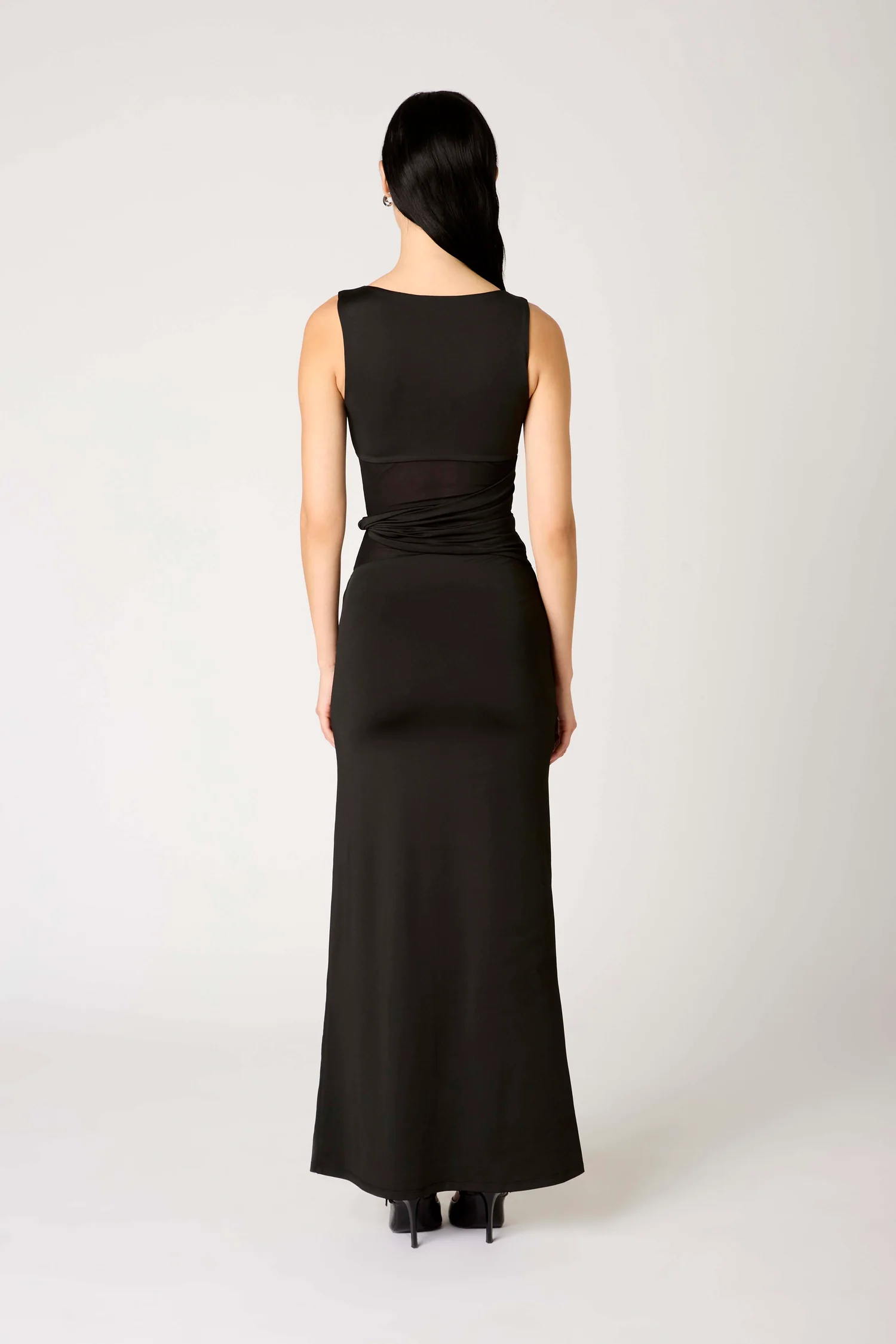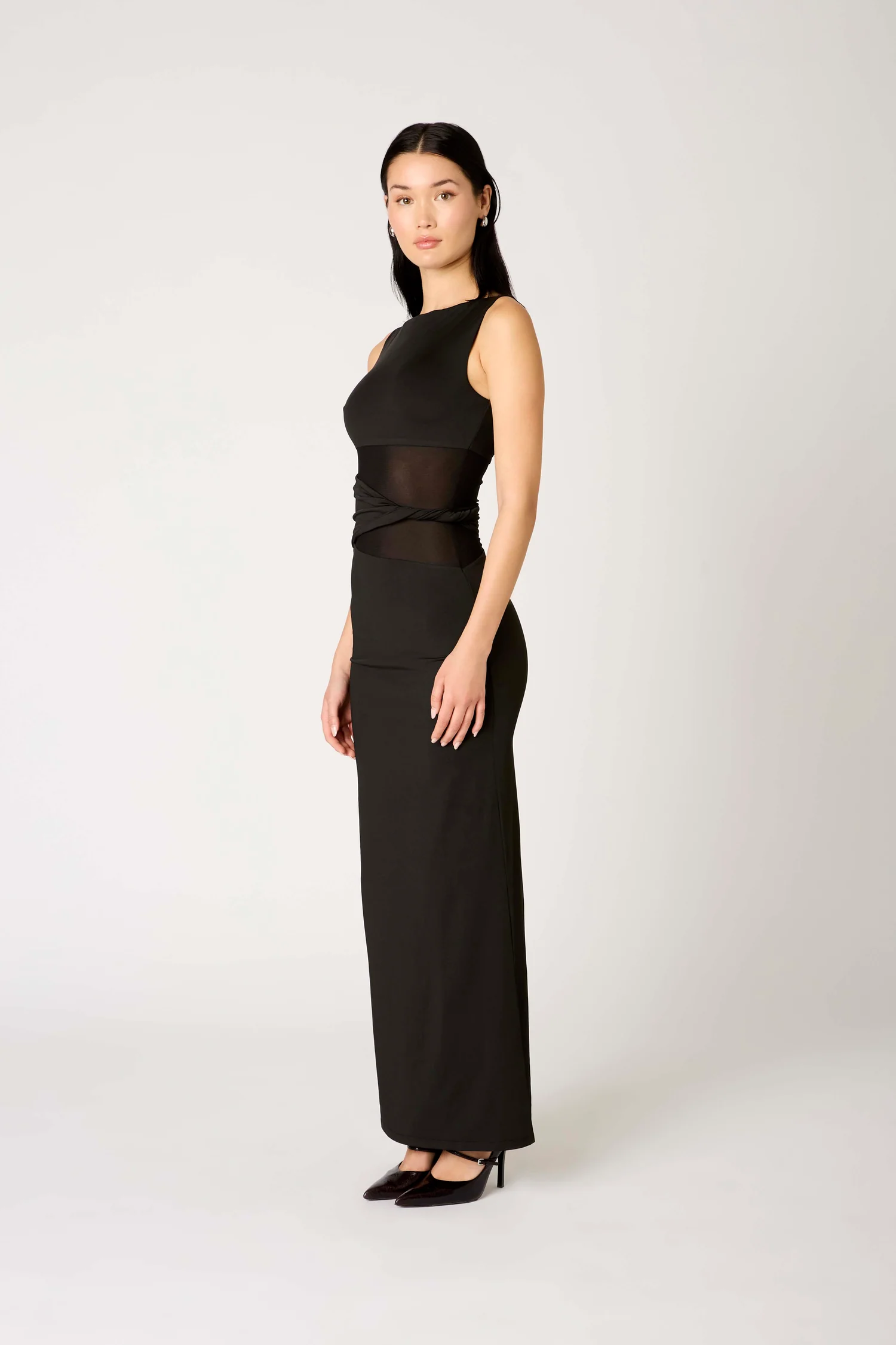 Minimal doesn’t have to mean simple. The Ione Dress features a high halter neckline and twist waistband design that defines the waist, balanced by a sheer mesh midriff for subtle contrast. The maxi-length silhouette keeps the look streamlined, while the unlined construction adds to the lightweight, body-skimming feel.