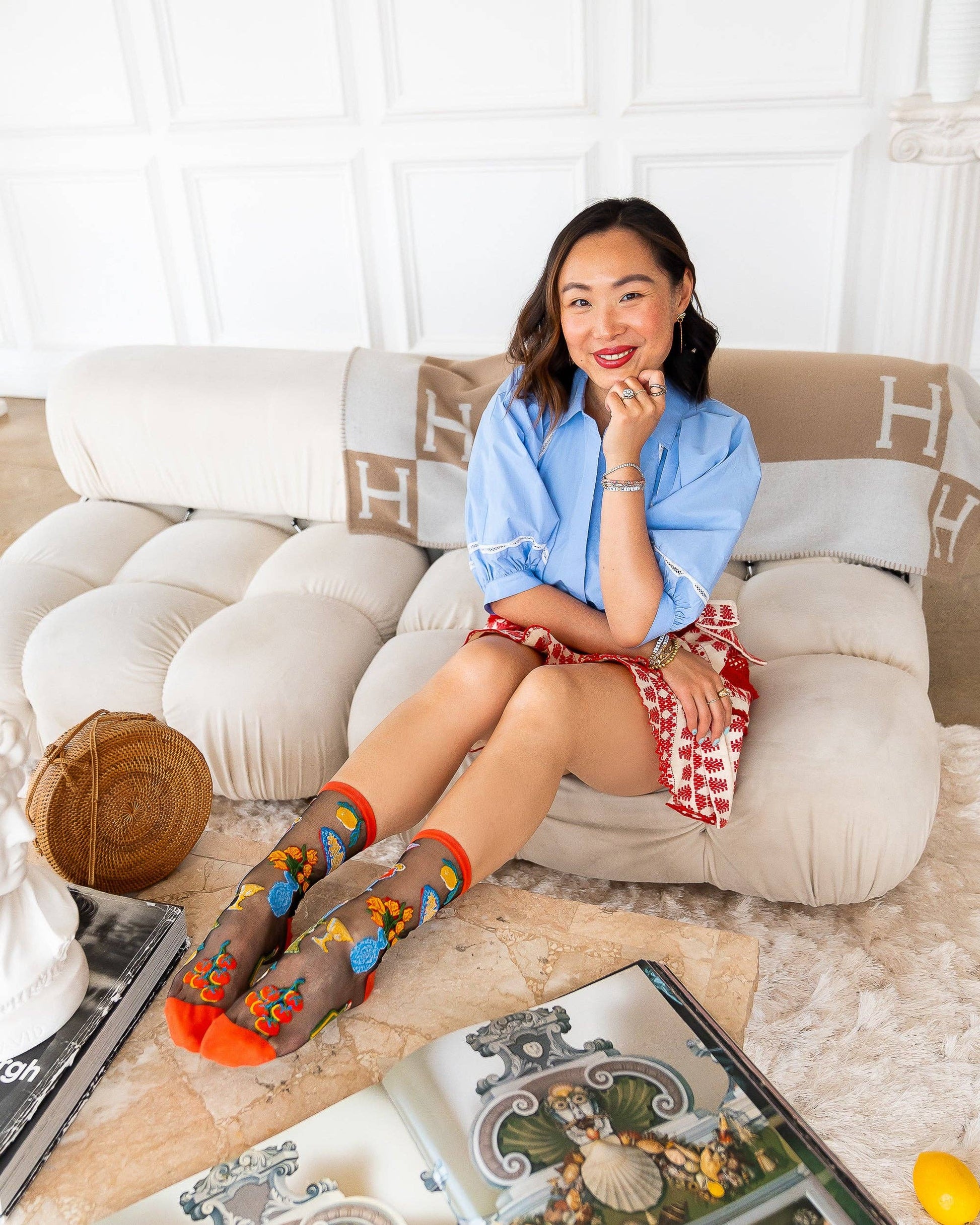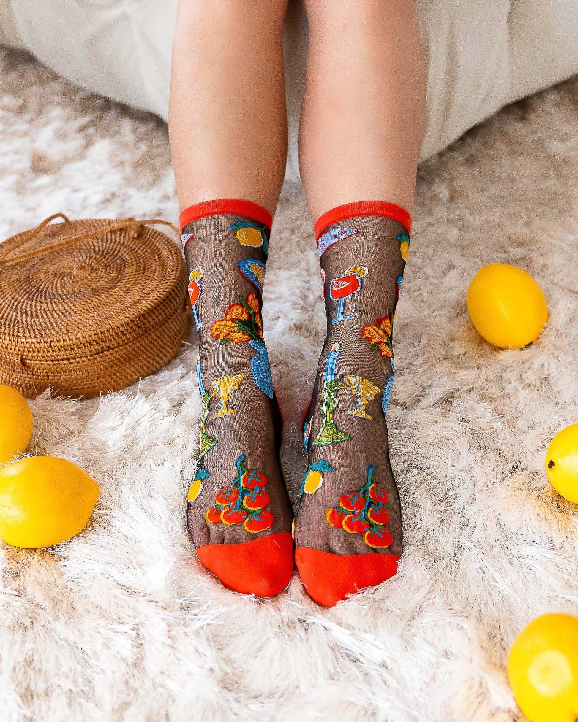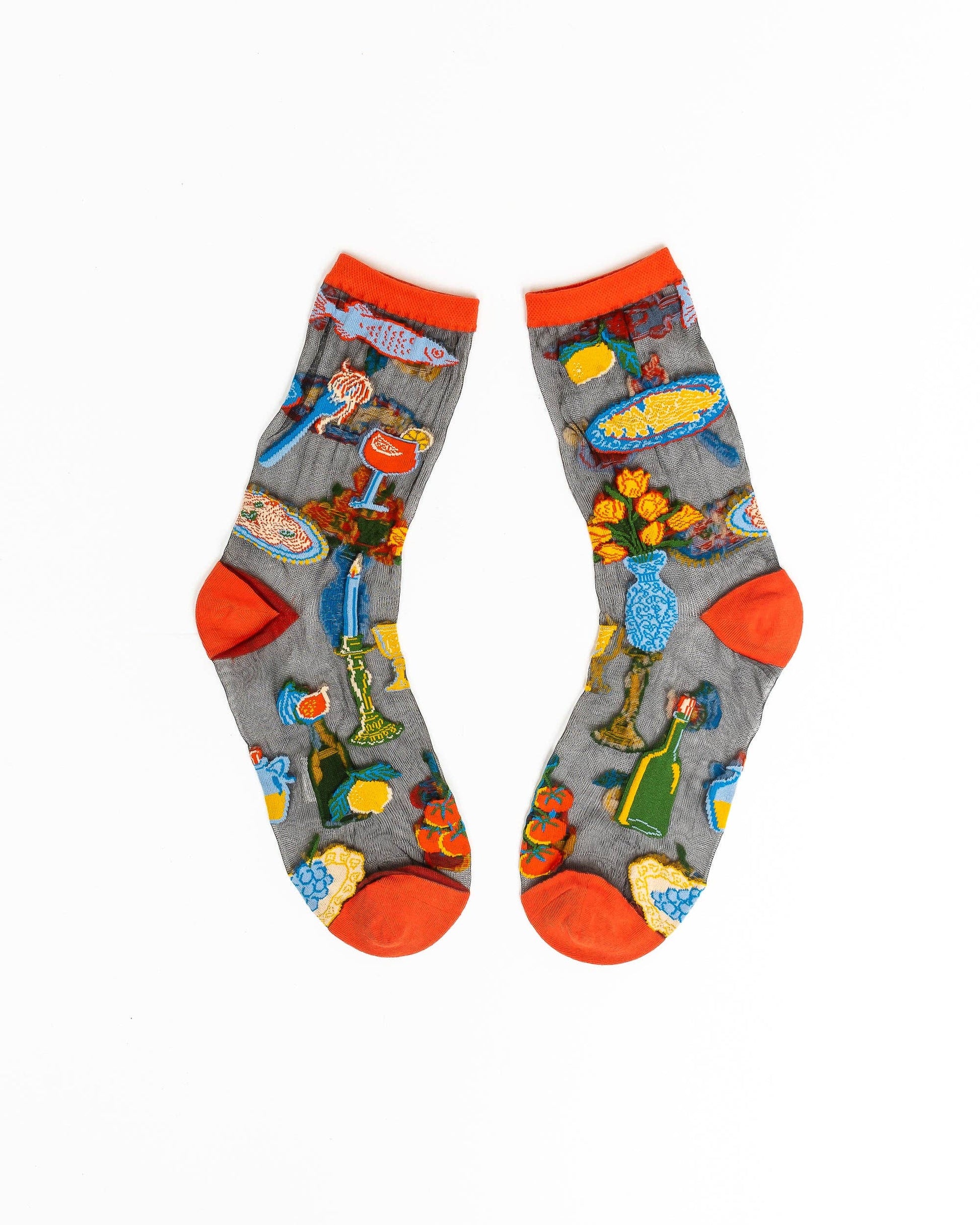 Transport yourself to Italy in the La Dolce Vita black sheer sock, featuring classic elements of an Italian dinner table complete with fresh pasta and fish, rustic florals, and vintage wine glasses. The perfect Italian summer is within your reach whenever and wherever you are. Pair with red sandals and an Aperol Spritz.