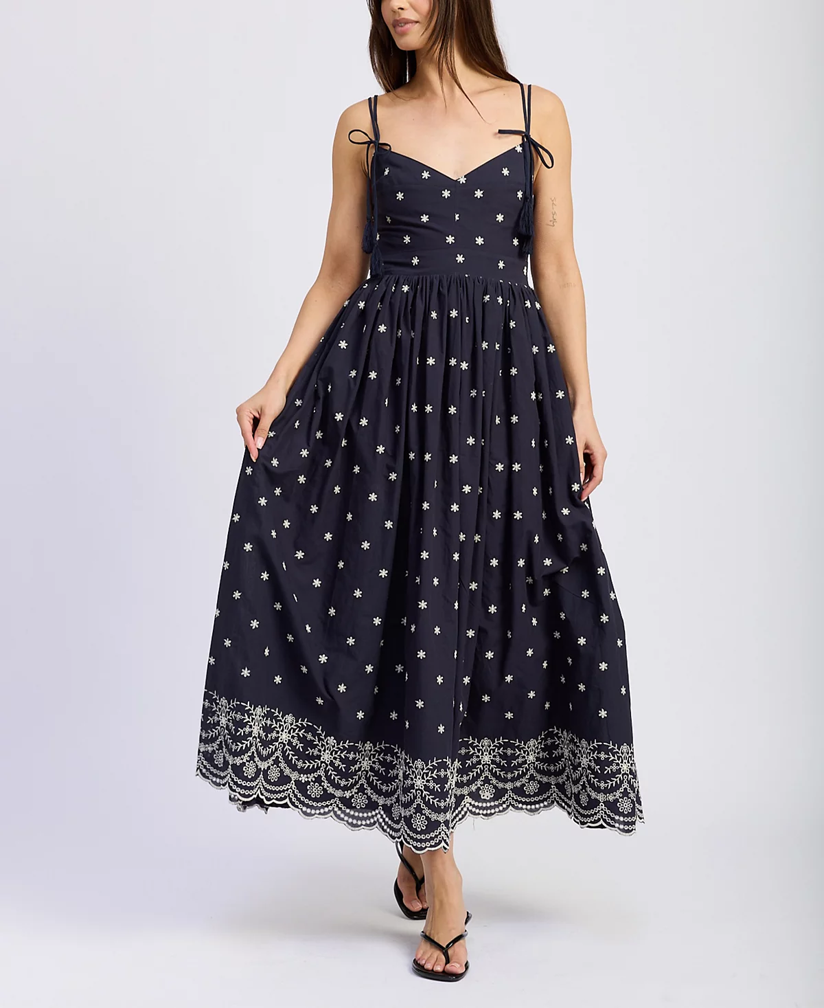 This embroidered midi sleeveless dress from En Saison features chic tie shoulder straps for a beautifully refined and sophisticated look.