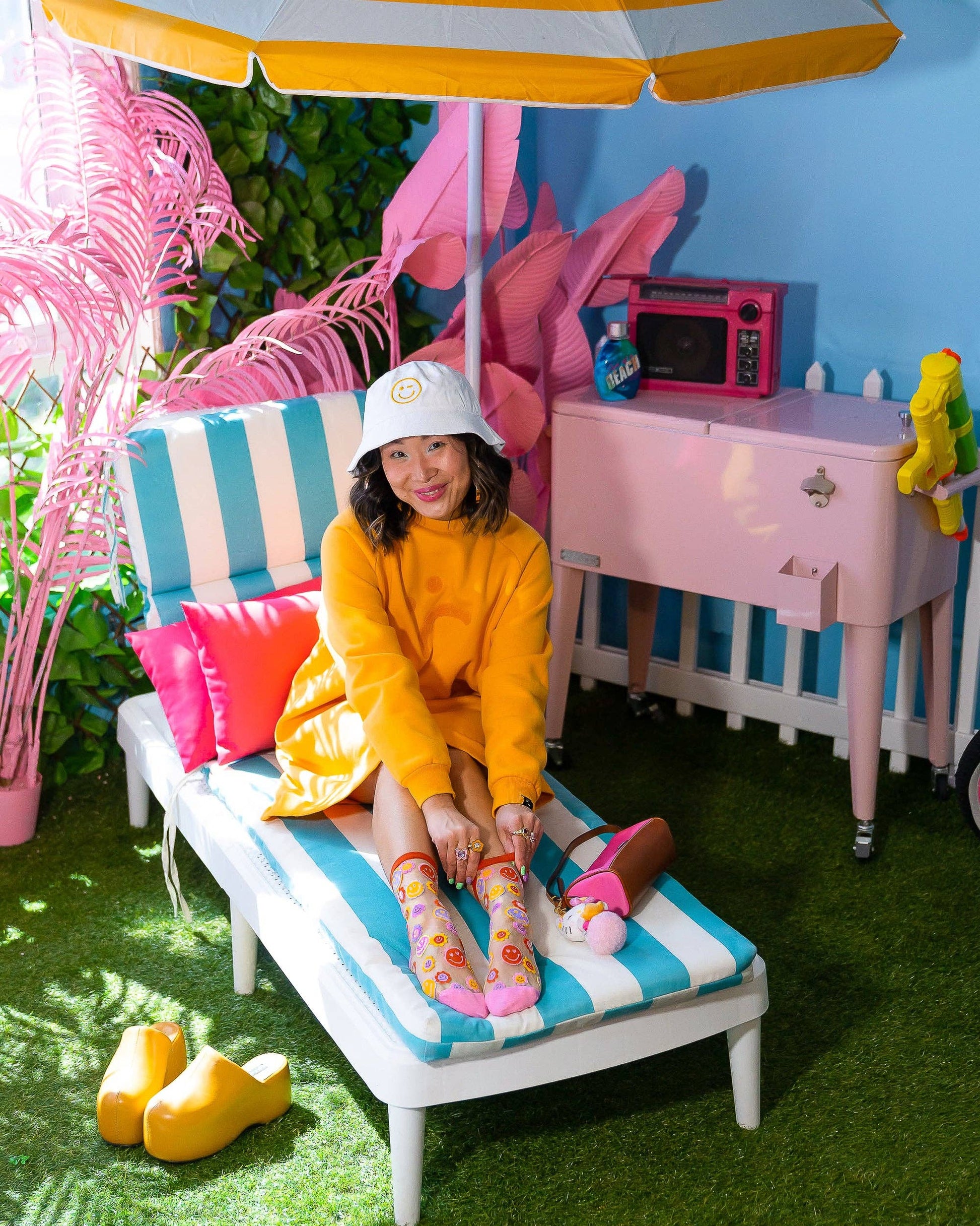 Eye-catching smiley faces in pastel colors are guarantee to make your feet happy. Funky details with daisy petals and heart eyes make this smiley face sheer sock better than your basic fashion sock. Finished with a pink toe and heel for maximum cheerfulness.