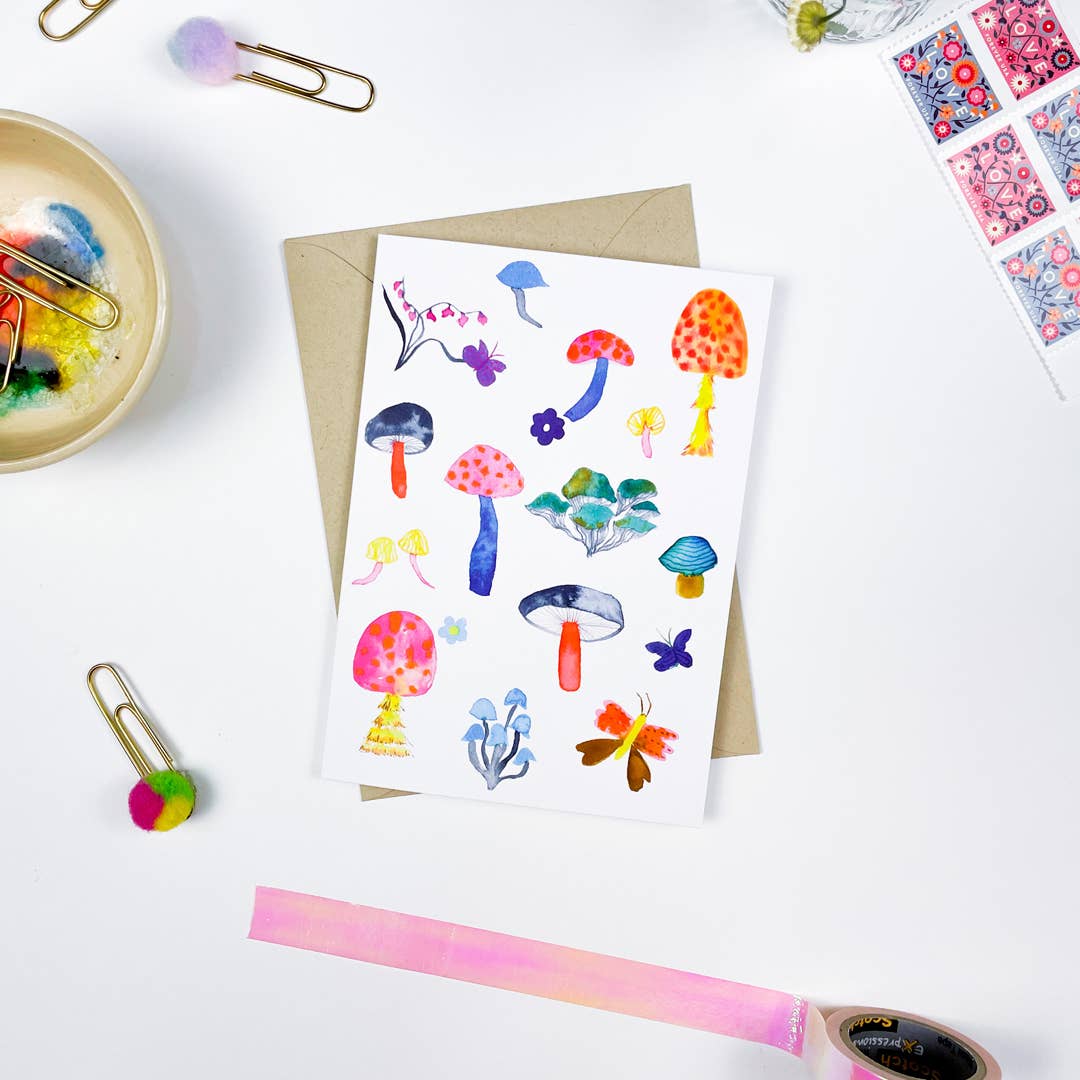 This bright and quirky card features a collection of hand painted watercolor mushrooms.
